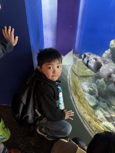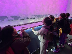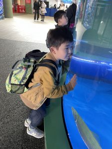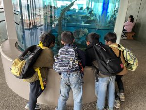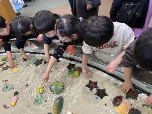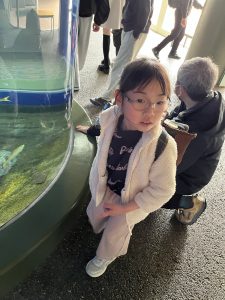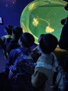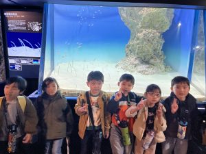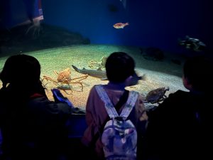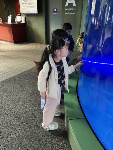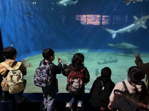 水族館に着くと、大きな水槽の前で目を丸くしたり、「見て見て!」と指をさしたり、興奮した表情がたくさん見られました。ゆったり泳ぐエイや色鮮やかな魚たちに、子どもたちは夢中になっていました🙄