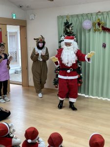 会が始まるとどこからか鈴の音が…🔔̪🦌サンタさんとトナカイさんの登場に子どもたちは大興奮😀サンタさんも一緒にみんなの出し物を鑑賞してくれました👀