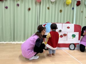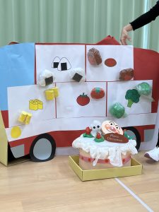 1歳児さんは、バスにお弁当のおかずを貼ってお弁当🍱バスの完成!みんなが大好きな「バスごっこ」と「あわてんぼうのサンタクロース」の歌を披露してくれました🥰