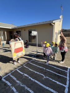 まずは、信号の色の意味をみんなで確認しました。「赤は止まる」「青になったら渡る」など、子どもたちは元気いっぱいに答えていました。