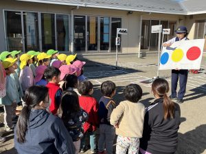 まずは、信号の色の意味をみんなで確認しました。「赤は止まる」「青になったら渡る」など、子どもたちは元気いっぱいに答えていました。