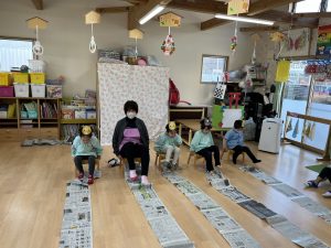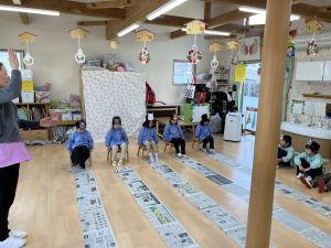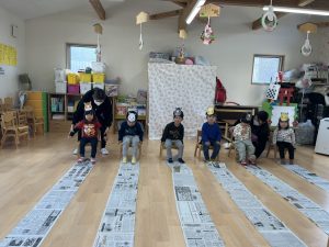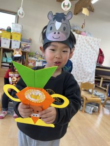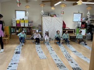 そのあとは今年の干支!午🐴になりきって足をつかって新聞紙たぐりよせレースを行いました。クラスで1位になったお友だちには先生特製のにんじん🥕トロフィーが渡されました。みんな足を上手に使って必死になって頑張っていましたよ🐎