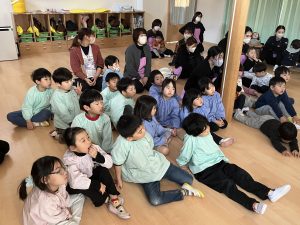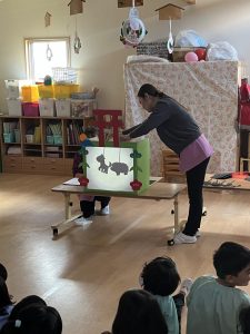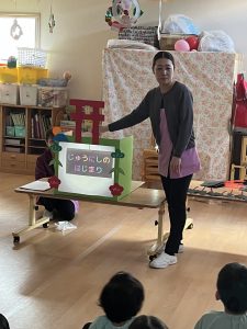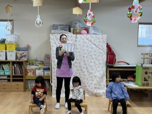 新年にぴったりの「12支のはじまり」のお話。いつもとは違う雰囲気で影絵でのお話が始まりました。動物たちが競争しながら順番を決めていく場面では、子どもたちが聞き入っていて、「ぼくは○○年!」「あ、うまさんだ!」と楽しそうな声があちこちから聞こえてきました😃