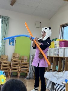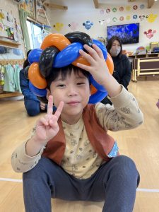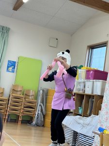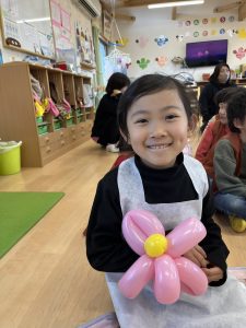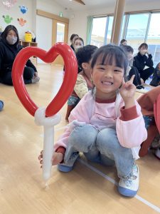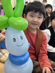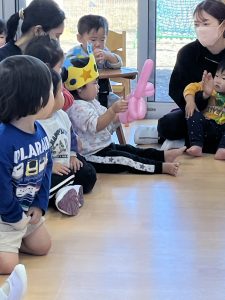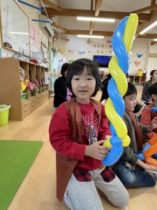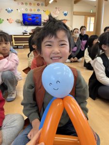 続いて先生からの出し物はバルーンアート🎈この日のために毎日練習してきてくれました!長い風船が何になるのか興味津々の子どもたち✨完成したものをみて「すごーい!!」「かわいい♡」との声が聞かれました😁